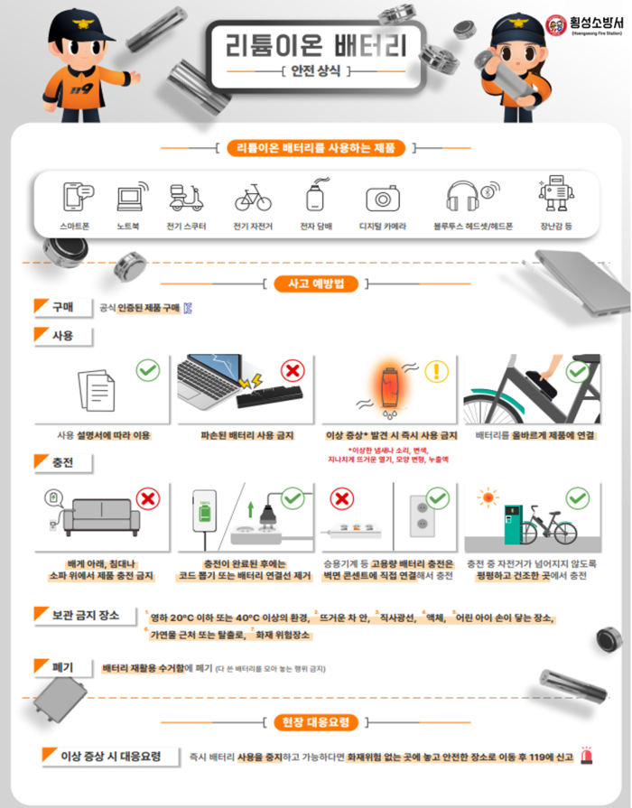 횡성소방서는 ▲정품 배터리·충전기 사용 ▲충전 중 장시간 방치 금지 ▲직사광선·난방기기 등 고온 환경에서 사용·보관 금지 ▲배터리 충격 및 변형 주의 ▲이상 징후(부풀음·이상 발열 등) 발생 시 즉시 사용 중지와 교체 등을 강조했다.