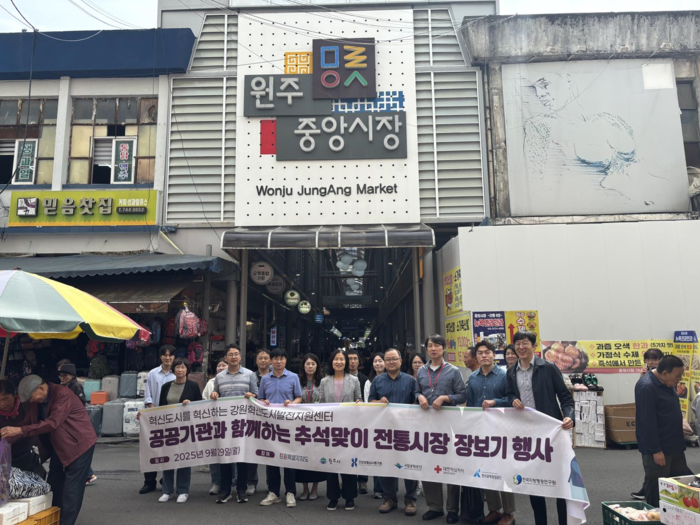 [스포츠서울ㅣ원주=김기원기자]강원혁신도시발전지원센터(이사장 김진태)는 추석 명절을 앞둔 9월 29일(월), 5개 이전 공공기관과 함께 원주시 소재 전통시장을 방문하여 각자내기 점심식사와 전통시장 장보기 행사를 진행했다.
