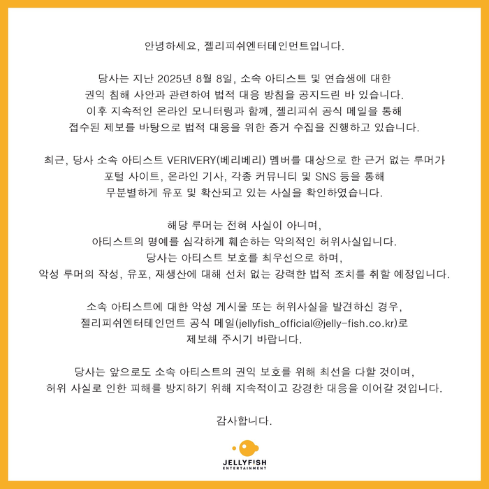 젤리피쉬는 이미 지난 8월 소속 아티스트 권익 침해와 관련해 법적 대응 방침을 공지한 바 있다. 회사 측은 “지속적인 온라인 모니터링과 공식 메일 제보를 통해 증거 수집을 진행 중”이라며 “아티스트 보호를 최우선으로 하여 허위사실로 인한 피해를 방지하기 위해 강경 대응을 이어가겠다”고 강조했다.