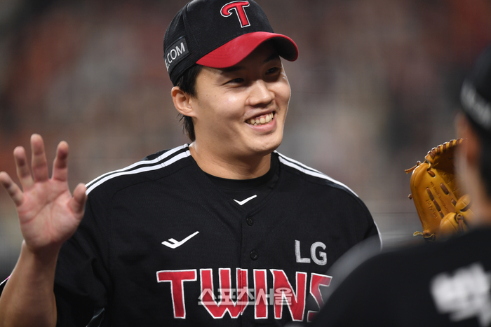 LG 선발투수 임찬규가 29일 대전 한화생명볼파크에서 열린 2025 KBO리그 한화와 경기 5회말 2사2루 상대 리베라토 안타 때 상대 2루주자 최재훈의 홈 상황이 아웃으로 판정이 번복되자 웃으며 덕아웃으로 들어오고 있다.