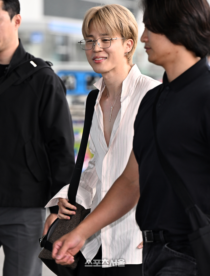 이날 지민은 크림색 스트라이프 셔츠에 블랙 와이드 팬츠를 매치한 시크한 스타일링으로 등장해 시선을 사로잡았다. 특히 여유로운 실루엣의 스트라이프 셔츠는 몇 개의 단추를 풀어 편안하면서도 세련된 분위기를 연출했다. 여기에 와이드핏 블랙 팬츠를 조합해 모던하고 트렌디한 감각을 드러냈다. 액세서리로는 얇은 프레임의 사각 안경과 실버 체인 목걸이, 십자가 펜던트로 포인트를 줬다. 손목에는 시선을 끄는 메탈 워치를 착용해 디테일을 완성했다. 블랙 크로스백과 백팩으로 실용성까지 더한 지민의 스타일은 ‘공항 패션의 정석’을 보여줬다.