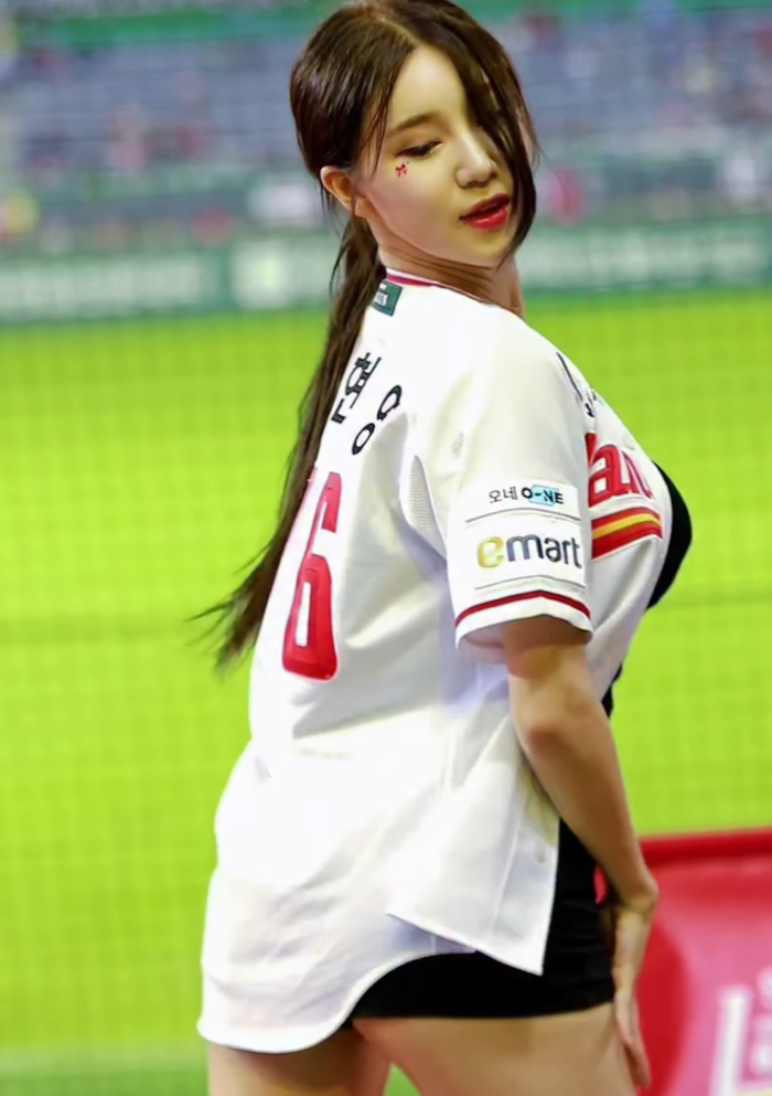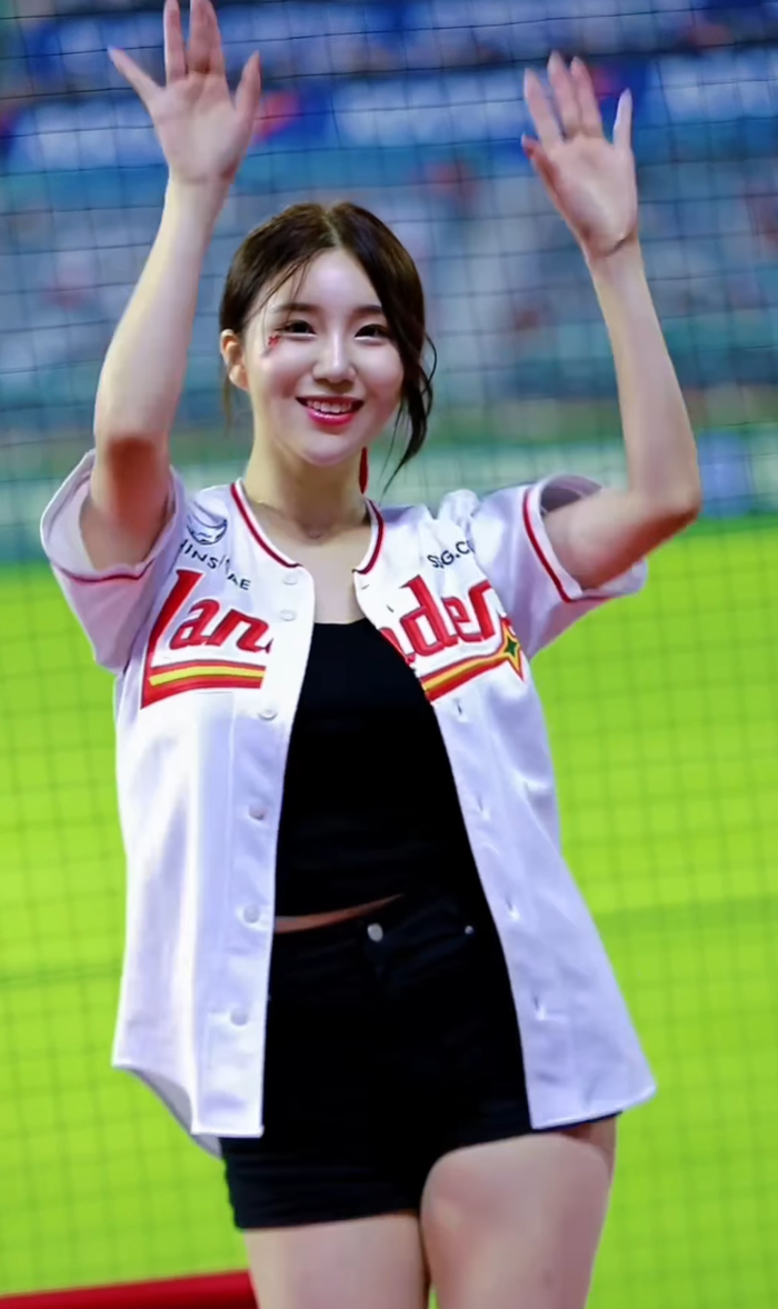 블랙 티셔츠와 핫팬츠를 입고 그 위에 SSG 유니폼을 걸친 김현영은 글래머러스한 몸매를 뽐내며 팀 승리에 힘을 보탰다.