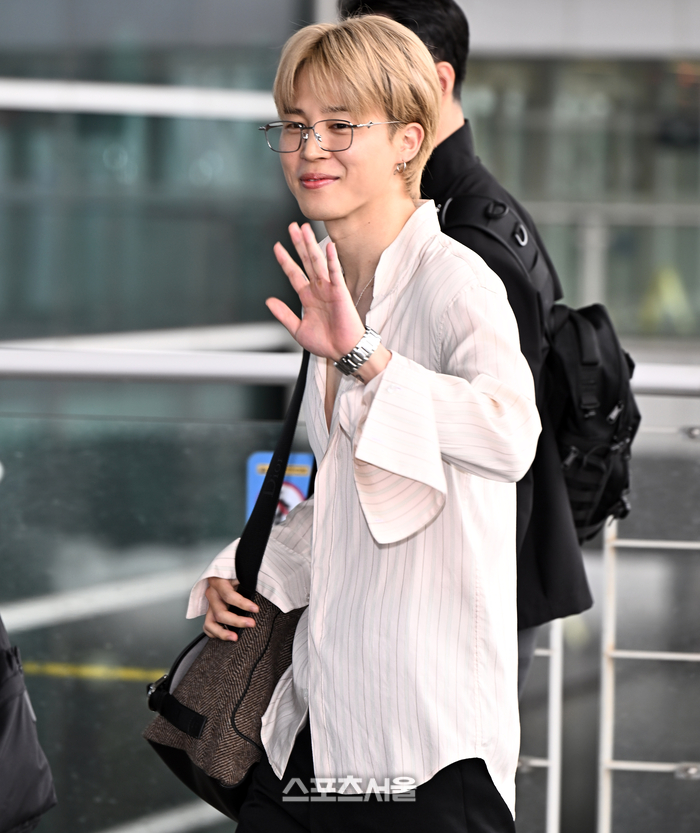 이날 지민은 크림색 스트라이프 셔츠에 블랙 와이드 팬츠를 매치한 시크한 스타일링으로 등장해 시선을 사로잡았다. 특히 여유로운 실루엣의 스트라이프 셔츠는 몇 개의 단추를 풀어 편안하면서도 세련된 분위기를 연출했다. 여기에 와이드핏 블랙 팬츠를 조합해 모던하고 트렌디한 감각을 드러냈다. 액세서리로는 얇은 프레임의 사각 안경과 실버 체인 목걸이, 십자가 펜던트로 포인트를 줬다. 손목에는 시선을 끄는 메탈 워치를 착용해 디테일을 완성했다. 블랙 크로스백과 백팩으로 실용성까지 더한 지민의 스타일은 ‘공항 패션의 정석’을 보여줬다.