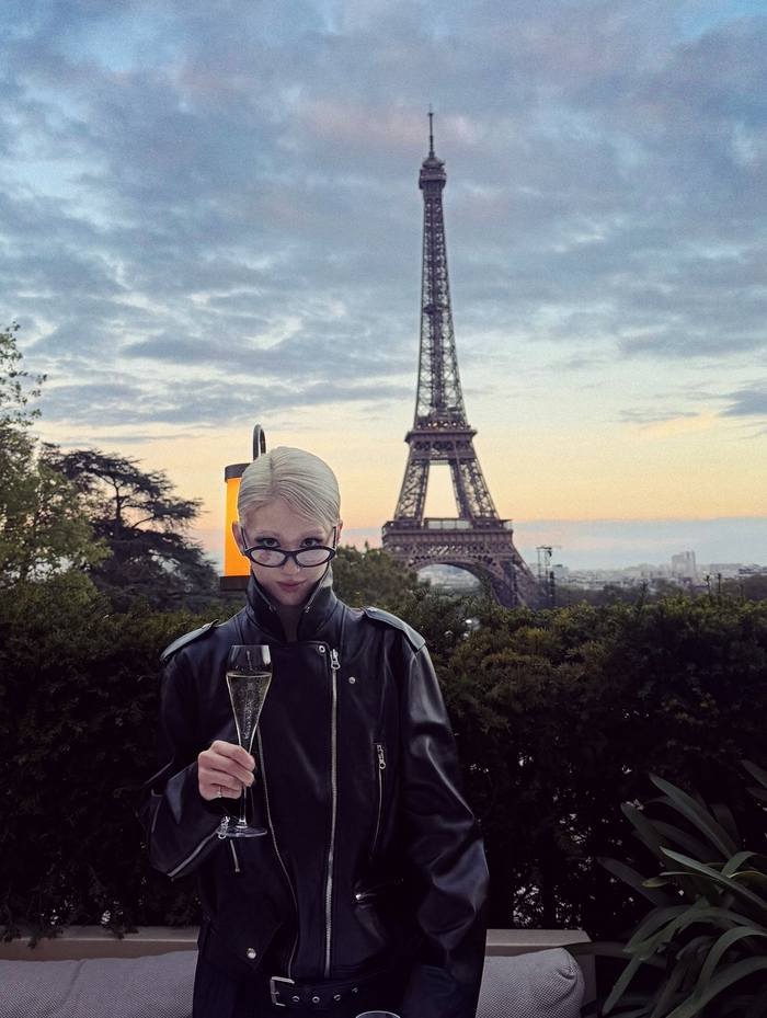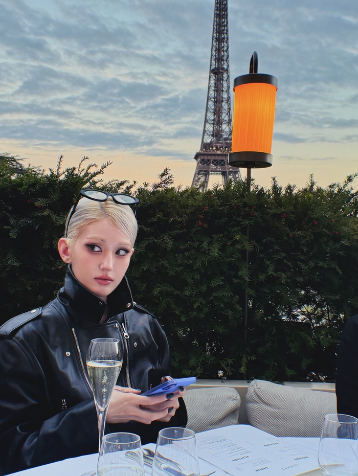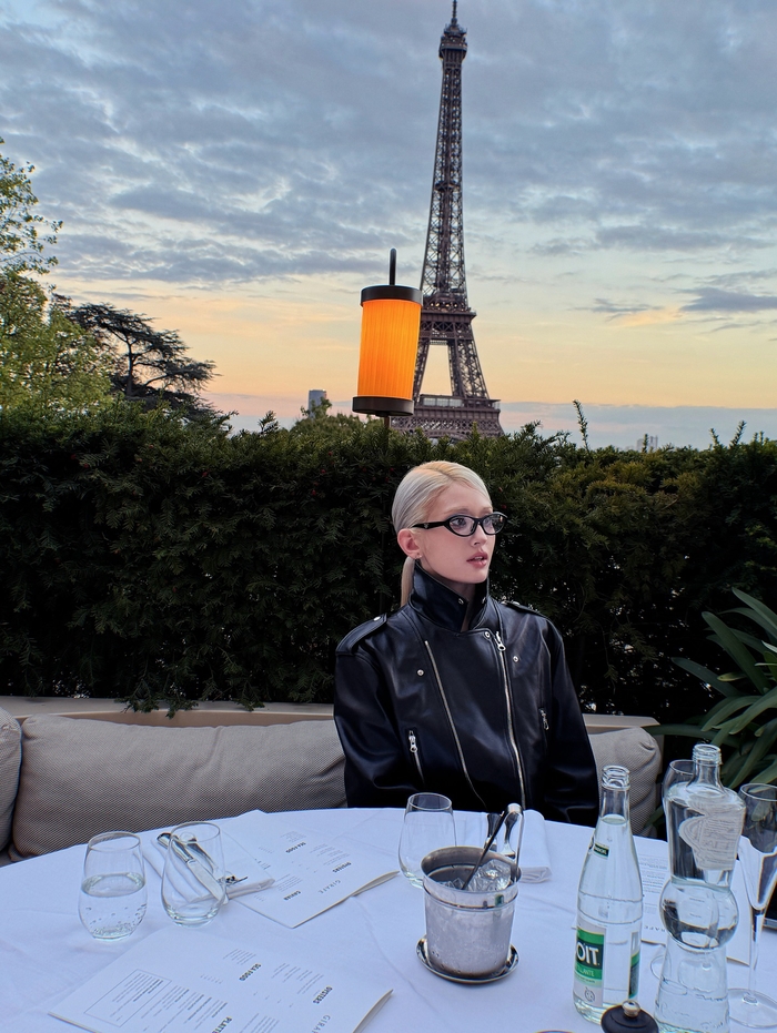 사진 속 전소미는 황혼이 지는 에펠탑을 배경으로 한 레스토랑 테라스에 앉아있다. 그녀는 블랙 레더 재킷을 시크하게 소화하며 특유의 금발 헤어와 대비되는 강렬한 매력을 발산했다. 특히, 가죽 재킷의 높은 칼라를 세우고 착용한 뿔테 안경이나 선글라스는 지적인 분위기마저 더하며 ‘패셔니스타’의 면모를 드러냈다.