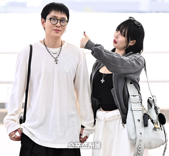 특히 두 사람은 화이트와 블랙을 기조로 한 컬러 조합에 십자가 펜던트와 체인 액세서리 등 디테일한 소품까지 맞춰 ‘찰떡 커플룩’을 완성했다. 손을 꼭 잡고 애정 넘치는 모습을 보인 이들은 하트를 만들어 보이며 달콤한 신혼의 행복을 과시하기도 했다. 현아와 용준형 부부는 각자의 개성을 살리면서도 조화로운 스타일링으로 ‘패션 커플’의 위상을 다시 한 번 입증했다. 두 사람의 자유롭고 힙한 패션은 SNS를 통해 빠르게 확산되며 팬들의 뜨거운 반응을 얻고 있다.
