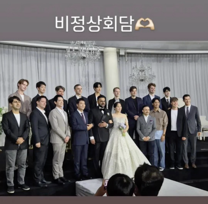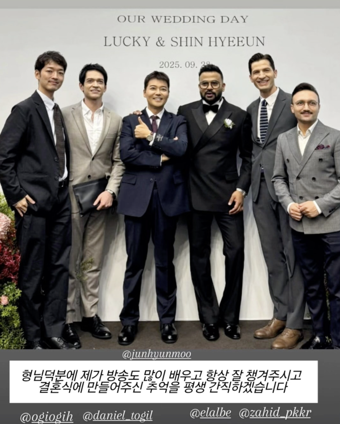 이날 결혼식은 ‘축제’ 그 자체였다. 방송인 전현무가 사회를 맡았으며, 특히 럭키와 JTBC ‘비정상회담’에서 함께 활약했던 알베르토 몬디, 다니엘 린데만, 줄리안 퀸타르트, 기욤 패트리, 테라다 타쿠야, 수잔 샤키야 등 ‘글로벌 절친’들이 총출동해 진한 의리를 과시했다.