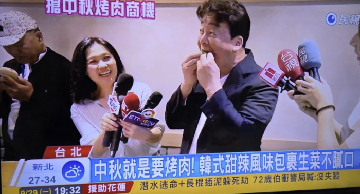 30일, 온라인 커뮤니티를 통해 공개된 사진 속 백종원은 대만의 한 TV 뉴스 프로그램에 출연해 한국식 바비큐를 소개하며 특유의 ‘맛깔나는’ 표정을 짓고 있다. 사진에는 “中秋就是要烤肉! 韓式甜辣風味包菜生菜不膩口 (추석에는 바비큐! 한국식 달콤하고 매콤한 맛의 상추쌈이 느끼하지 않아)”라는 자막이 선명하게 보인다.