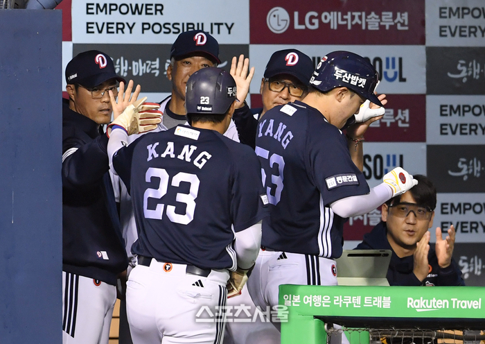 두산 조성한 감독대행(맨 왼쪽)이 30일 잠실구장에서 열린 2025 KBO리그 LG와의 경기 4회초 1사 1루 상황에서 LG 선발 송승기를 상대로 2점 홈런을 친 양석환(오른쪽)과 함께 득점한 강승호와 하이파이브를 나누고 있다. 2025. 9. 30.