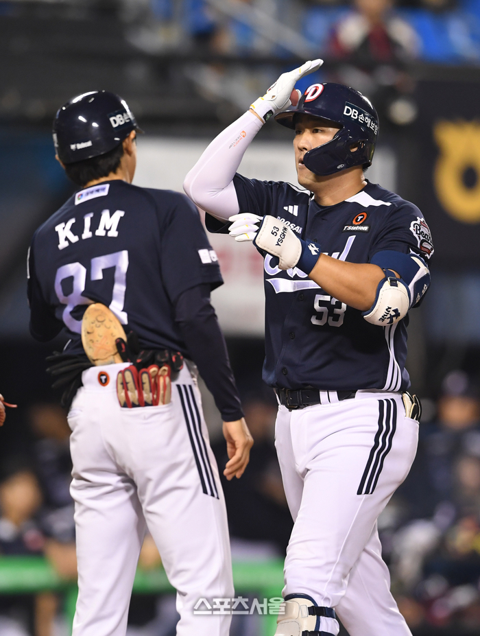 두산 양석환이 30일 잠실구장에서 열린 2025 KBO리그 LG와의 경기 4회초 1사 1루 상황에서 LG 선발 송승기를 상대로 2점 홈런을 치고 김재현 코치와 하이파이브를 하고 있다. 양석환의 시즌 8호 홈런. 2025. 9. 30.