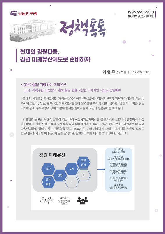 [스포츠서울ㅣ춘천=김기원기자]강원연구원(원장 배상근)은 “현재의 강원다움, 강원 미래유산제도로 준비하자”라는 제목으로 2025년 제39호 정책톡톡을 발간했다.