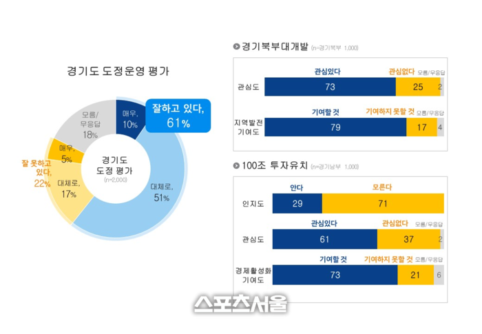경기남부지역 도민 1000명을 대상으로 한 조사에서는 ‘100조 투자유치’에 대한 기대감이 두드러졌다. 남부지역 도민은 투자유치 정책에 대한 인지도는 29%로 낮았으나, 관심도는 61%에 달했고, 일자리 창출과 지역경제 활성화에 기여할 것이라는 응답도 73%로 높게 나타났다.