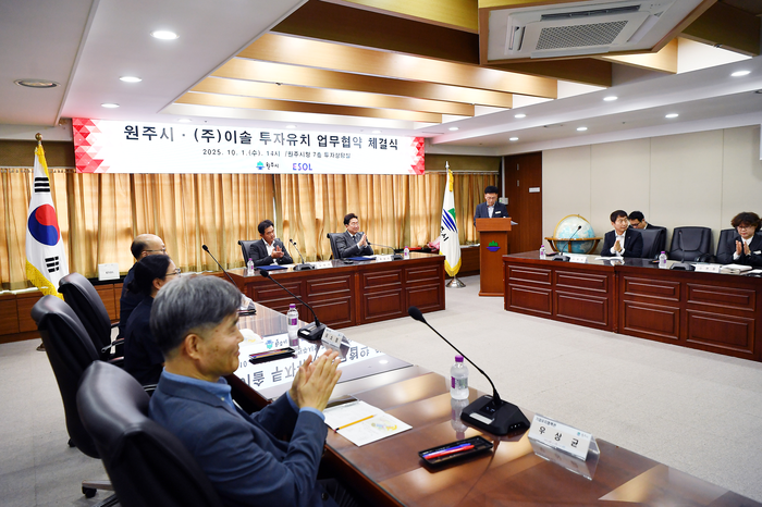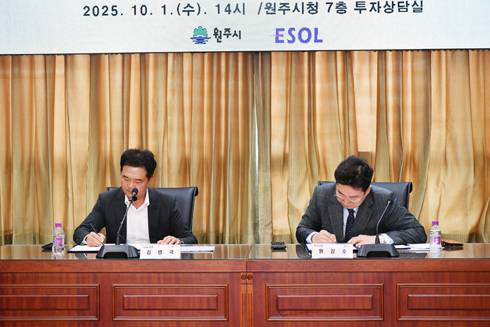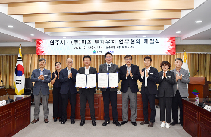 [스포츠서울ㅣ원주=김기원기자]원주시는 10월 1일 오후 2시, 시청 7층 투자상담실에서 ㈜이솔(대표 김병국)과 투자유치 협약(MOU)을 체결했다. 이번 협약은 총 505억 원 규모의 투자로, 부론일반산업단지에 소형 방사광가속기와 첨단 EUV 반도체 검사장비 연구·생산시설을 구축하는 사업이다. EUV(Extreme Ultra-Violet)는 반도체 초미세 공정(7nm 이하)에 필수적인 광원이다.