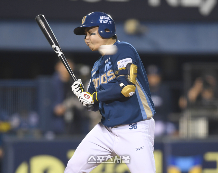 NC 권희동이 1일 서울 잠실구장에서 열린 2025 KBO리그 LG와 경기 6회초 2사만루 상대 투수 김영우의 투구를 피하고 있다.