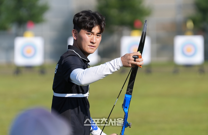 양궁 리커브 국가대표 김제덕(예천군청)이 1일 광주광역시 광주국제양궁장과 5·18 민주광장 일대에서 열린 ‘현대자동차 정몽구배 한국양궁대회 2025’ 리커브 남자 통합 개인 예선전에서 코칭스태프를 바라보고 있다. 2025. 10. 1. 대한양궁협회 제공.