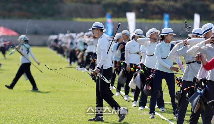 양궁 리커브 국가대표 안산(광주은행 텐텐양궁단)이 1일 광주광역시 광주국제양궁장과 5·18 민주광장 일대에서 열린 ‘현대자동차 정몽구배 한국양궁대회 2025’ 리커브 여자 통합 개인 예선전을 마친 뒤 사대에서 벗어나고 있다. 2025. 10. 1. 대한양궁협회 제공.