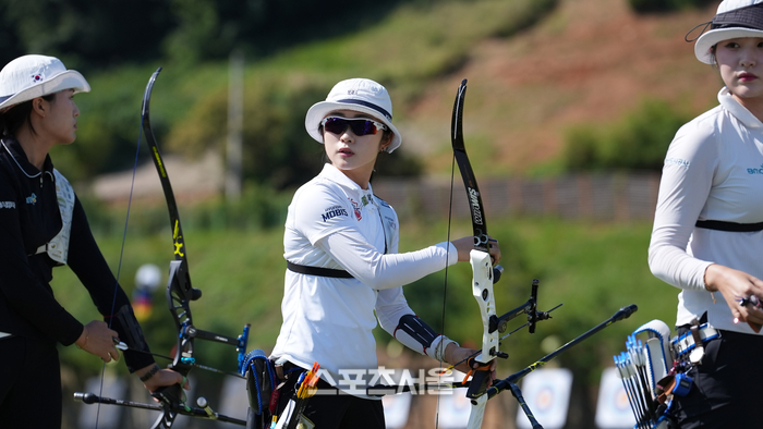 이윤지(현대모비스)가 1일 광주광역시 광주국제양궁장과 5·18 민주광장 일대에서 열린 ‘현대자동차 정몽구배 한국양궁대회 2025’ 리커브 여자 통합 개인 예선전에서 코칭스태프를 바라보고 있다. 2025. 10. 1. 대한양궁협회 제공.