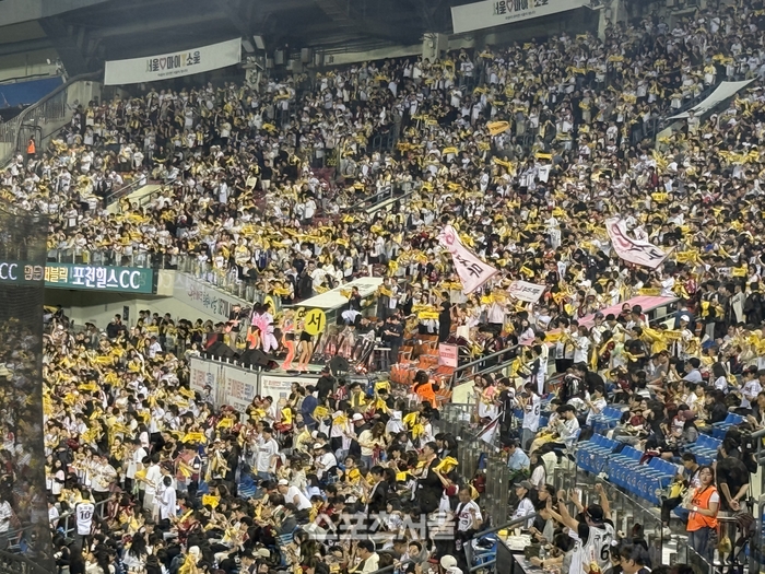 이날 경기 중 LG 팬의 목소리가 가장 큰 순간이다. SSG 득점이 나왔다. 한화에 오후 9시 35분 기준 SSG 리드다. 이날 한화가 지면, 정규시즌 우승 확정이다. 잠실 분위기가 갑자기(?) 달아올랐다.