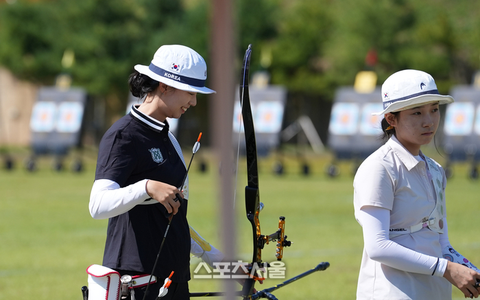 양궁 리커브 여자 국가대표 임시현(한국체육대학)이 1일 광주광역시 광주국제양궁장과 5·18 민주광장 일대에서 열린 ‘현대자동차 정몽구배 한국양궁대회 2025’ 리커브 여자 통합 개인 예선전에서 슈팅을 준비하며 미소를 짓고 있다. 2025. 10. 1. 대한양궁협회 제공.