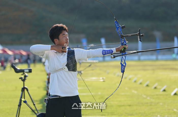 김태현(효원고)이 1일 광주광역시 광주국제양궁장과 5·18 민주광장 일대에서 열린 ‘현대자동차 정몽구배 한국양궁대회 2025’ 리커브 남자 통합 개인 예선전에서 화살을 쏘고 있다. 2025. 10. 1. 대한양궁협회 제공.