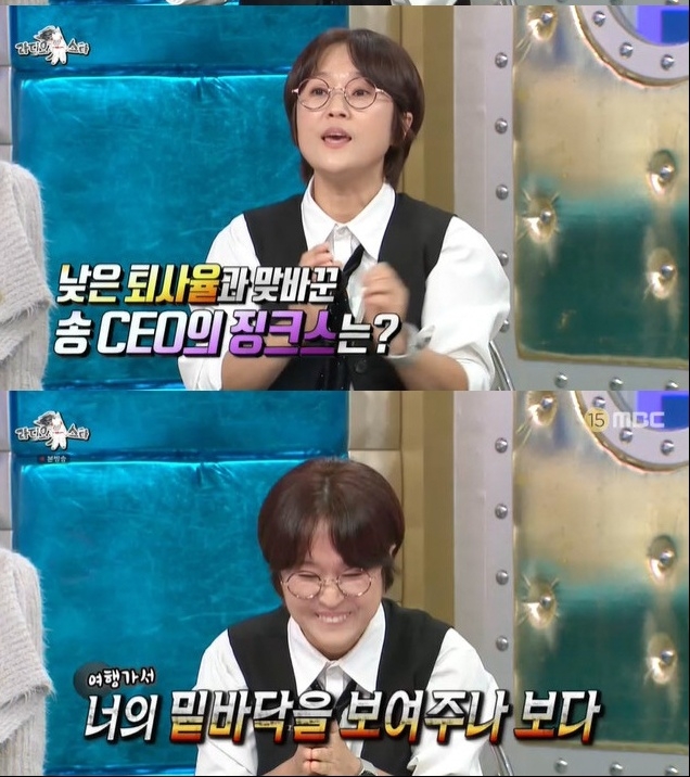 그러나 송은이 회사에는 묘한 징크스가 있다고. 그는 “퇴사율이 높은 건 아닌데, 나랑 당일치기 여행을 다녀온 직원들은 꼭 퇴사를 하더라”며 “내 돈 들여 맛집 데려가고, 기름값 쓰는데도 이상하게 다 퇴사한다”며 억울함을 토로해 웃음을 자아냈다. 이어 “녹화장에서 만난 연예인 사인을 받아다 준 직원들도 결국 다 회사를 떠났다”고 덧붙였다.
