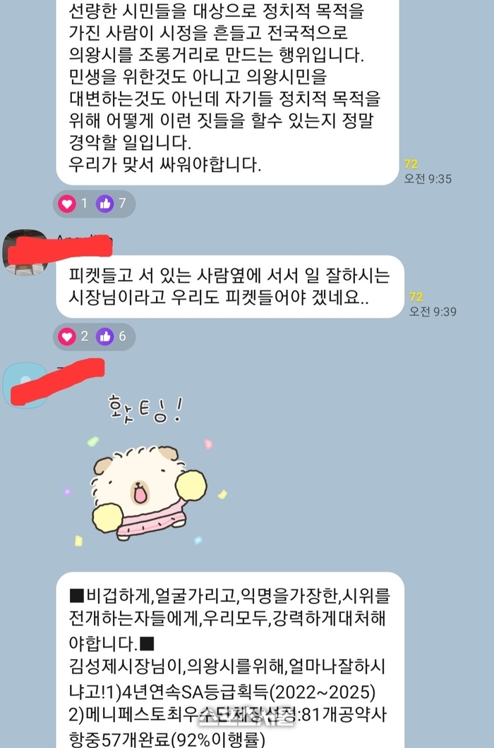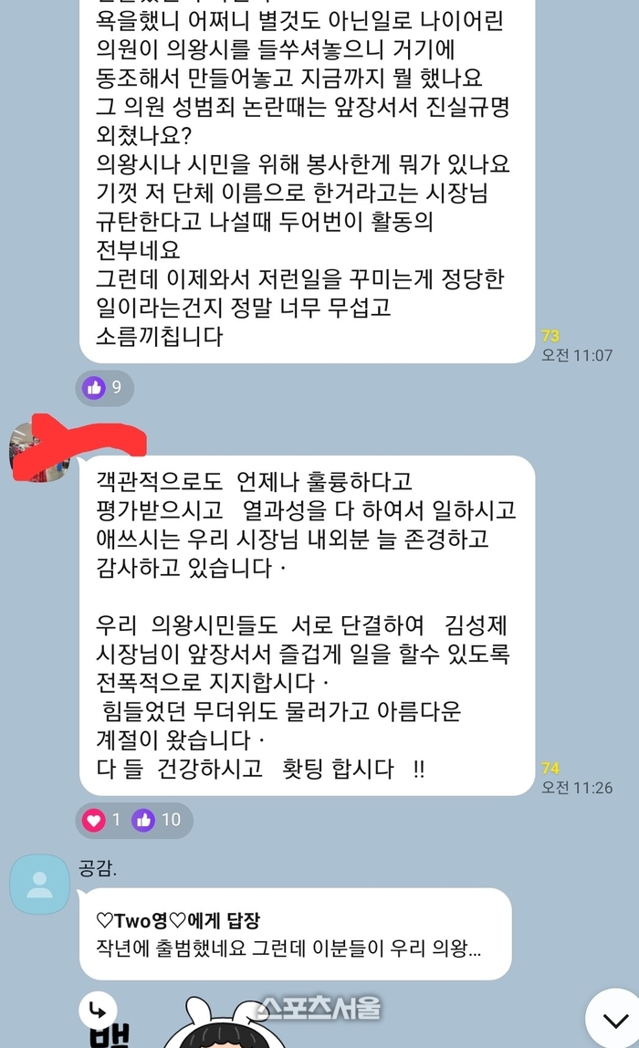 “정정당당하게 김성제 시장을 이기지 못하니 없는 사실을 꾸며 비방하는 것으로 내년 선거를 준비하는 것은 시민의 시선에서 좋게 보이지 않는다”는 비판의 글이 이어지고 있다.