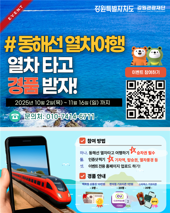 [스포츠서울ㅣ춘천=김기원기자]강원특별자치도(도지사 김진태)와 강원관광재단(대표이사 최성현)은 오는 10월 2일부터 11월 16일까지‘KTX 동해선 철도여행 인증 이벤트’를 운영한다고 밝혔다.