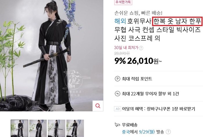 국내 다수 온라인 쇼핑몰에서 한복을 검색하면 한푸가 함께 노출된다. 사진 속 실루엣은 비슷하지만 명칭과 역사, 맥락은 전혀 다른 의복이 한 페이지에 섞여 있는 것.