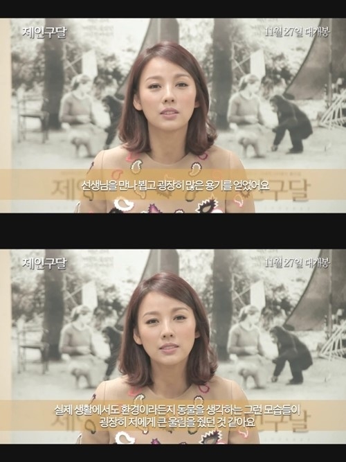 “동물과 환경보호에 대한 일을 하며 연예계 생활들에 제약들이 조금 있었다. 선생님을 만나 뵙고 굉장히 큰 용기를 얻었다… 한국에서 이런 일을 계속해서 알리는 사람이 되었으면 좋겠다는 부탁의 말씀도 해주셔서 최선을 다해야겠다는 마음을 먹었다”