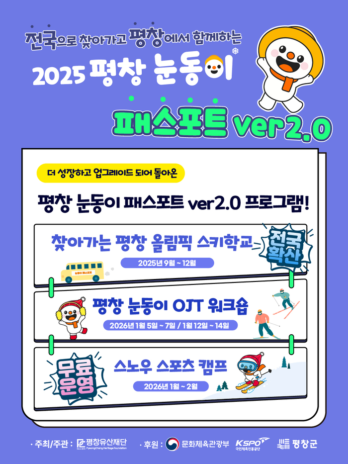 [스포츠서울ㅣ김기원기자]평창군과 평창유산재단(이사장 심재국)은 2018 평창 동계올림픽의 소중한 유산을 이어받아 온 ‘눈동이 패스포트’ 프로그램을 기반으로, 확대버전인 ‘눈동이 패스포트 ver.2.0’을 새롭게 선보이며, 전국 단위로 대폭 확대 운영한다고 발표했다.
