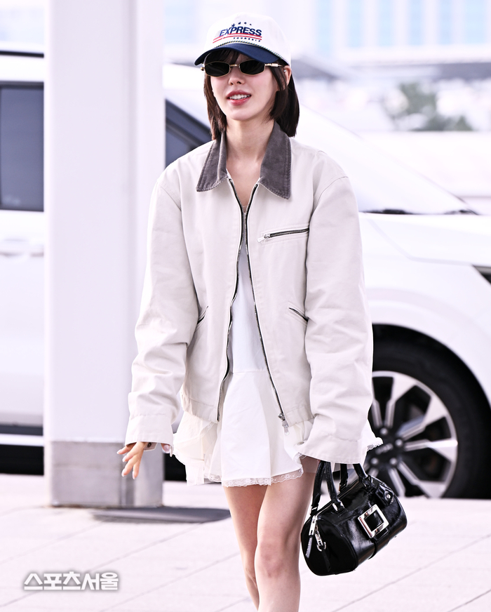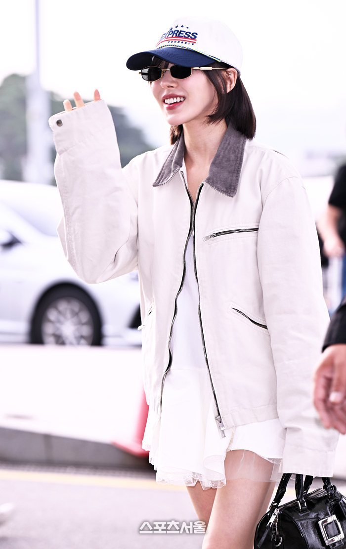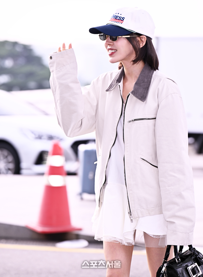 액세서리로는 ‘EXPRESS YOU’ 로고가 새겨진 화이트 & 네이비 배색의 캡틴 스타일 모자를 착용해 스포티한 감각을 더했다. 선글라스와 블랙 미니백을 함께 들어 실용성과 스타일을 동시에 잡았다.