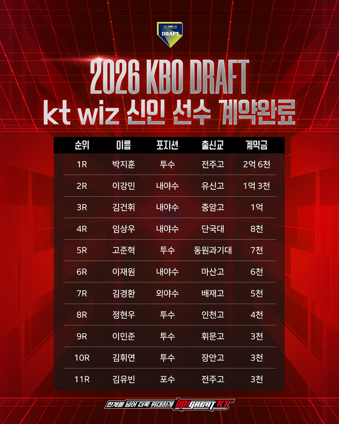 한편 KT는 지난달 17일 열린 2026 KBO 신인드래프트에서 총 11명의 선수(투수 5명, 포수 1명, 내야수 4명, 외야수 1명)를 지명했다. sshong@sportsseoul.com