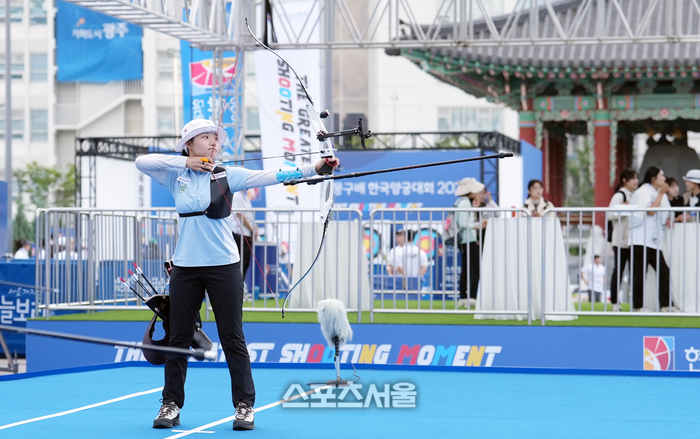 정다영(한국체육대학교)이 2일 광주광역시 광주국제양궁장과 5·18 민주광장 일대에서 열린 ‘현대자동차 정몽구배 한국양궁대회 2025’ 리커브 여자 통합 개인 16강전에서 화살을 쏘고 있다. 2025. 10. 2. 대한양궁협회 제공.