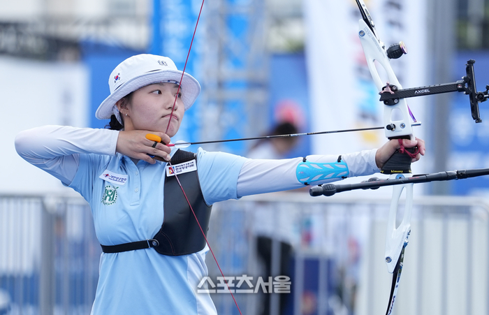 정다영(한국체육대학교)이 2일 광주광역시 광주국제양궁장과 5·18 민주광장 일대에서 열린 ‘현대자동차 정몽구배 한국양궁대회 2025’ 리커브 여자 통합 개인 16강전에서 화살을 쏘고 있다. 2025. 10. 2. 대한양궁협회 제공.