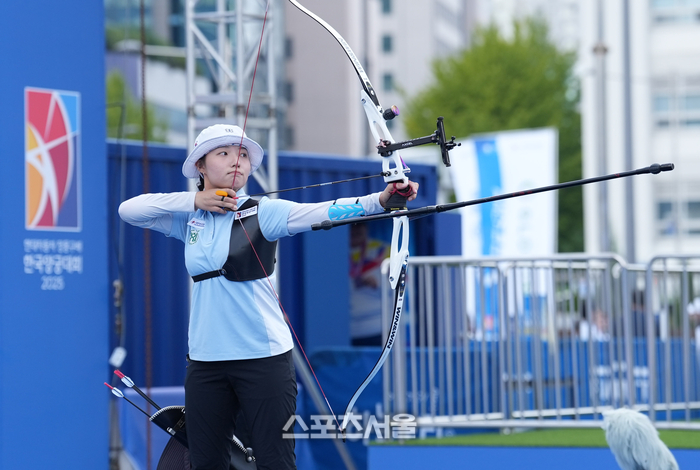 정다영(한국체육대학교)이 2일 광주광역시 광주국제양궁장과 5·18 민주광장 일대에서 열린 ‘현대자동차 정몽구배 한국양궁대회 2025’ 리커브 여자 통합 개인 16강전에서 화살을 쏘고 있다. 2025. 10. 2. 대한양궁협회 제공.