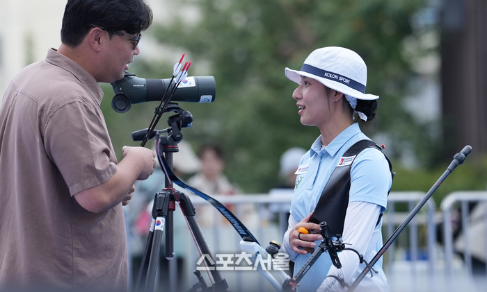 정다영(한국체육대학교)이 2일 광주광역시 광주국제양궁장과 5·18 민주광장 일대에서 열린 ‘현대자동차 정몽구배 한국양궁대회 2025’ 리커브 여자 통합 개인 16강전에서 코칭스태프와 이야기를 나누고 있다. 2025. 10. 2. 대한양궁협회 제공.