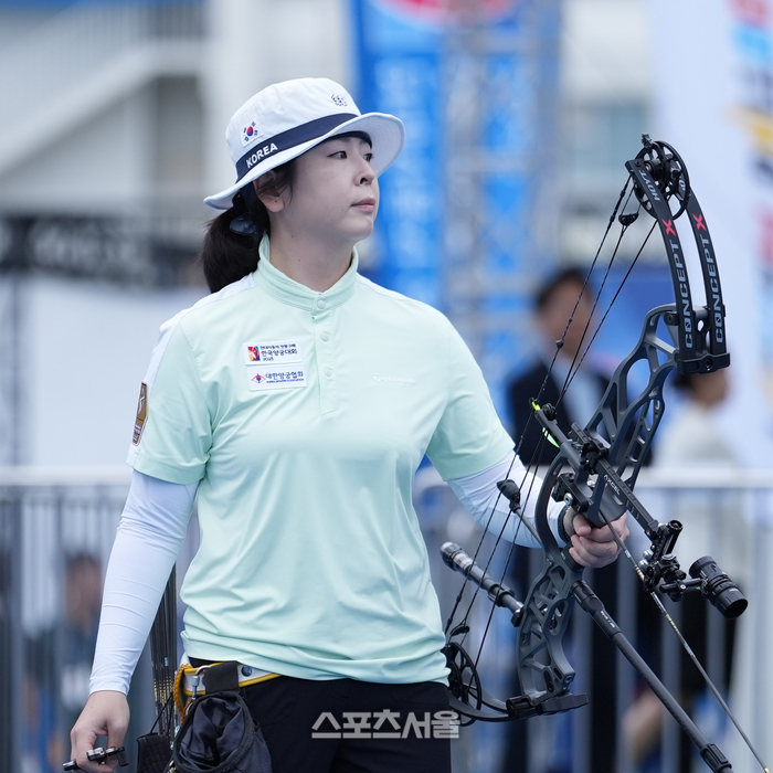 오유현(전북도청)이 2일 광주광역시 광주국제양궁장과 5·18 민주광장 일대에서 열린 ‘현대자동차 정몽구배 한국양궁대회 2025’ 컴파운드 여자 통합 개인 16강전에서 슈팅을 준비 하고 있다. 2025. 10. 2. 대한양궁협회 제공.