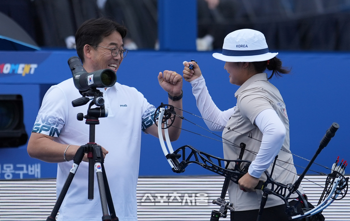유희연(현대모비스)이 2일 광주광역시 5·18 민주광장에서 열린 ‘현대자동차 정몽구배 한국양궁대회 2025’ 컴파운드 여자 통합 개인 8강전에서 승리한 뒤 코칭스태프와 주먹을 맞대고 있다. 2025. 10. 2. 대한양궁협회 제공.