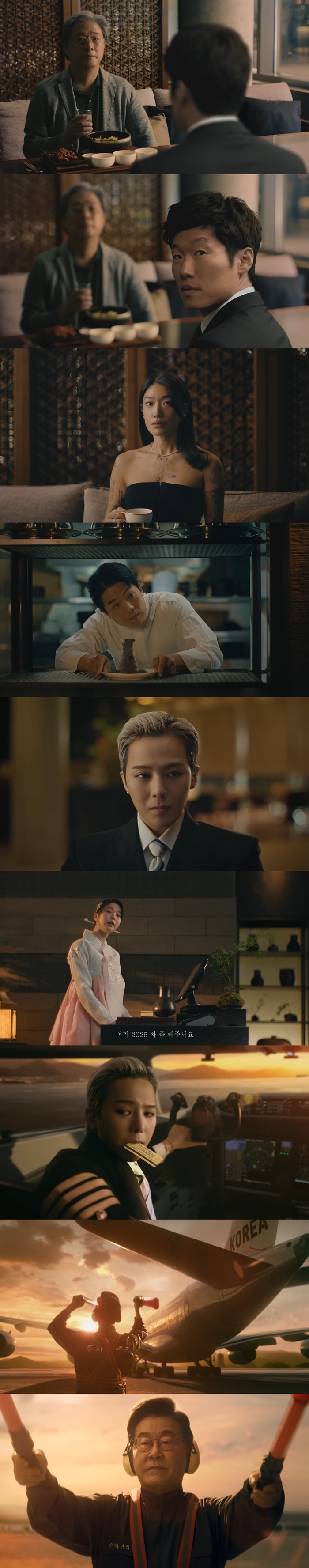 영상 내용은 ‘돌고래유괴단’ 신 감독의 평소 연출 스타일대로 독특하면서도 재치 넘친다. 한옥 디자인의 한식당에 파일럿 지드래곤이 등장해 APEC 회원국 파일럿들과 만나는 장면으로 시작한다. 지드래곤이 착석하며 “웰컴 투 APEC”이라고 말하는 순간, 한복을 곱게 차려입은 종업원 장원영이 “여기 2025 차 좀 빼주세요. 2025!”라고 외친다.