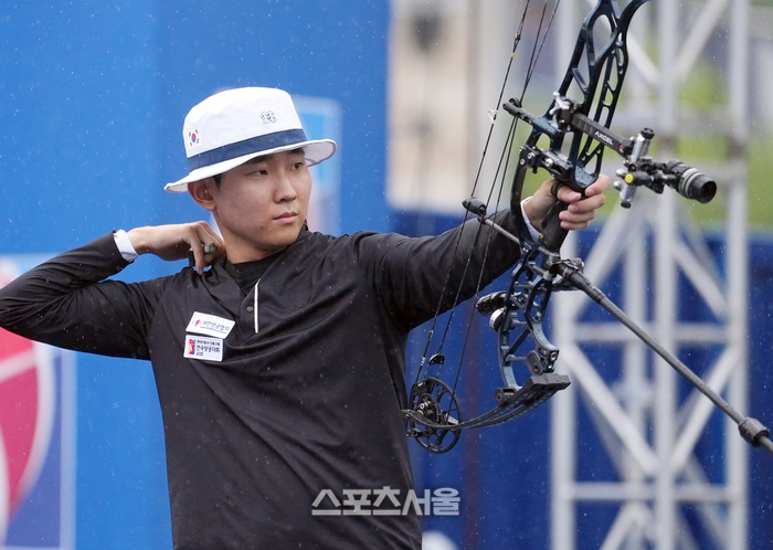 양재원(울산남구청)이 3일 광주광역시 5·18 민주광장에서 열린 ‘현대자동차 정몽구배 한국양궁대회 2025’ 컴파운드 남자 통합 개인 결승전에서 슈팅을 하고 있다. 양재원은 김종호(현대제철)을 슛오프 끝에 꺾고 오승을 차지했다. 대한양궁협회 제공.