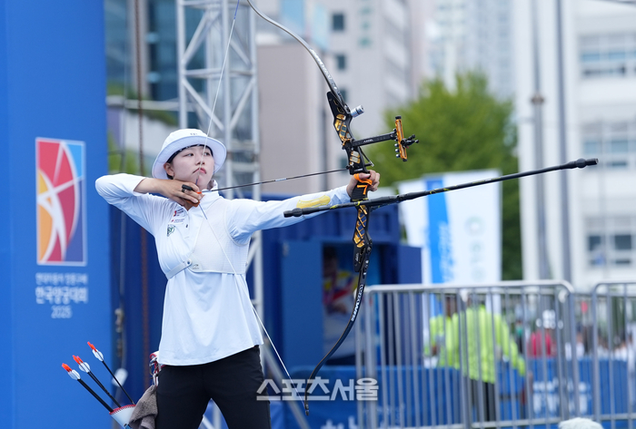 임시현은 3일 광주 5·18 민주광장에서 열린 현대자동차 정몽구배 한국양궁대회 2025 리커브 여자 결승전에서 강채영(현대모비스)을 세트 점수 7-3(29-28 28-28 29-29 27-27 29-28)으로 이겨 우승을 차지했다.