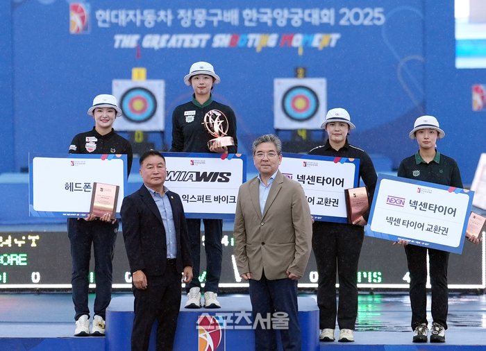 3일 광주광역시 5·18 민주광장에서 열린 ‘현대자동차 정몽구배 한국양궁대회 2025’ 시상식에서 리커브 여자 개인 수상자들이 기념촬영을 하고 있다. 왼쪽부터 2위 강채영(현대모비스), 시상자 서울특별시양궁협회 윤순백 회장, 1위 임시현(한국체대), 시상자 현대자동차그룹 장재훈 부회장, 3위 김수린(광주광역시청), 4위 정다영(한국체대). 대한양궁협회 제공.
