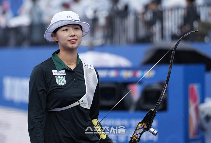 임시현(한국체대)이 3일 광주광역시 5·18 민주광장에서 열린 ‘현대자동차 정몽구배 한국양궁대회 2025’ 시상식에서 리커브 여자 개인 결승전에서 강채영(현대모비스)을 꺾고 우승을 차지한 뒤 기뻐하고 있다. 대한양궁협회 제공.