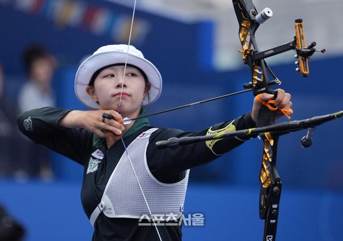 임시현(한국체대)이 3일 광주광역시 5·18 민주광장에서 열린 ‘현대자동차 정몽구배 한국양궁대회 2025’ 시상식에서 리커브 여자 개인 결승전에서 슈팅을 하고 있다. 임시현은 강채영(현대모비스)을 꺾고 우승을 차지했다. 대한양궁협회 제공.
