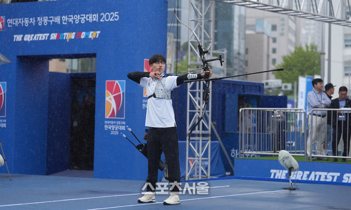 김종우(한국체대)가 3일 광주광역시 5·18 민주광장에서 열린 ‘현대자동차 정몽구배 한국양궁대회 2025’ 시상식에서 리커브 남자 개인 결승전에서 슈팅을 하고 있다. 김종우는 이우석(코오롱엑스텐보이즈)를 꺾고 우승을 차지했다. 대한양궁협회 제공.