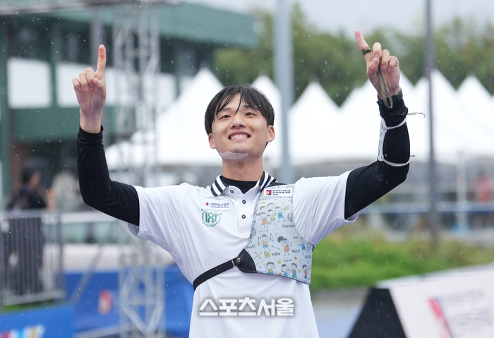 김종우(한국체대)가 3일 광주광역시 5·18 민주광장에서 열린 ‘현대자동차 정몽구배 한국양궁대회 2025’ 시상식에서 리커브 남자 개인 결승전에서 이우석(코오롱엑스텐보이즈)를 꺾고 우승을 차지하면서 기뻐하고 있다. 대한양궁협회 제공.