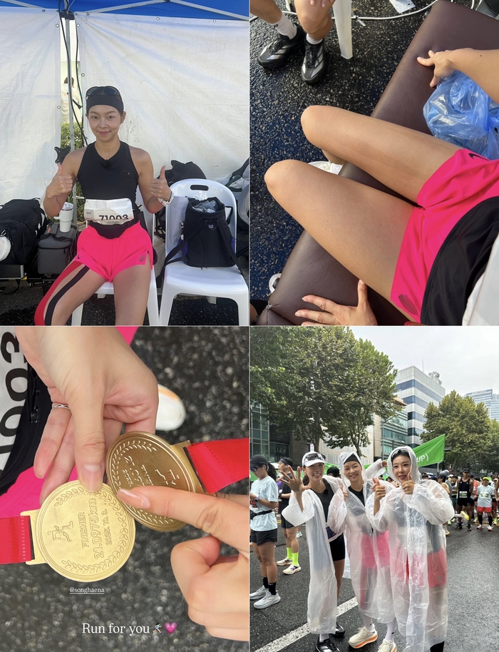 송해나는 4일 개인 SNS에 “고관절수술 이후 내가 하고 싶은 운동은 못할 거라 생각했고, 일 년간 아예 운동은 하지 못했는데, 조금씩 운동 시작하고 주변에서 제 속도로 맞춰주는 사람들이 너무 고마웠어요”라며 하프마라톤을 완주한 여러 장의 사진과 함께 메달을 공개했다.