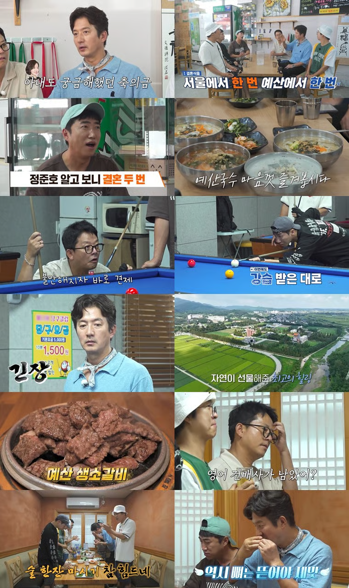 이후 정준호의 단골 식당이자, ‘예산 8미(味)’인 예산국수를 먹으러 갔다. 이곳에서 멸치국수, 콩국수 등을 푸짐하게 주문한 이들은 식당 한 켠에 걸린 정준호와 아내 이하정의 사진을 보고는 “형님 결혼식이 궁금하다”고 ‘결혼 토크’를 시작했다. 정준호는 “사실 내가 결혼을 두 번했다”고 돌발 고백하더니, “하객이 너무 많아서 서울에서 한 번, 예산에서 한 번 결혼식을 했다. 당시 예산에서 내 결혼식에 참석하겠다는 분들만 2500명이 됐다”고 어마무시한 인맥을 언급했다.
