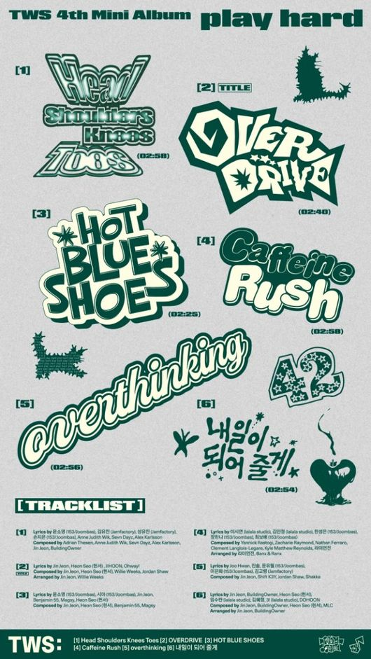 TWS(신유, 도훈, 영재, 한진, 지훈, 경민)는 4일 오후 10시 팀 공식 SNS를 통해 미니 4집‘play hard’의 트랙리스트를 공개했다. 이에 따르면 앨범에는 타이틀곡 ‘OVERDRIVE’와 지난달 22일 선공개된 ‘Head Shoulders Knees Toes’를 비롯해 수록곡 ‘HOT BLUE SHOES’, ‘Caffeine Rush’, ‘overthinking’, ‘내일이 되어 줄게’ 총 6곡이 실린다.