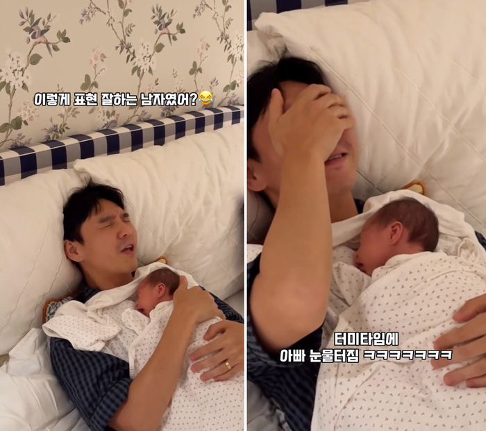 또한, 아빠 품에 안긴 아기가 터미타임을 하려는 듯 움직이자 최성욱이 손으로 얼굴을 가리며 감격에 젖은 듯한 모습을 보이자, 김지혜는 “터미타임에 아빠 눈물 터짐 ㅋㅋㅋ”이라고 덧붙이며 영상을 마무리했다.
