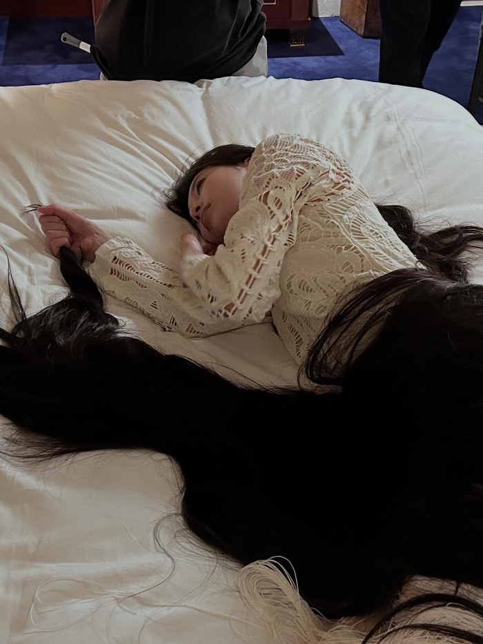 흰 레이스 블라우스를 입고 침대에 누워 있는 모습은 마치 ‘잠자는 숲속의 미녀’를 연상시킨다. 길게 늘어뜨린 풍성한 흑발이 신비로운 분위기를 자아낸다.